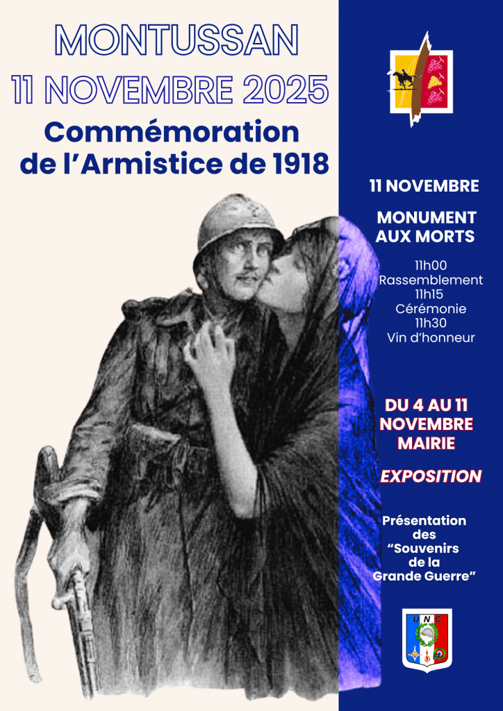 La municipalité et l’Union des Anciens Combattants de Montussan vous convient à assister à la commémoration du 107e anniversaire de l’Armistice du 11 novembre 1918 :