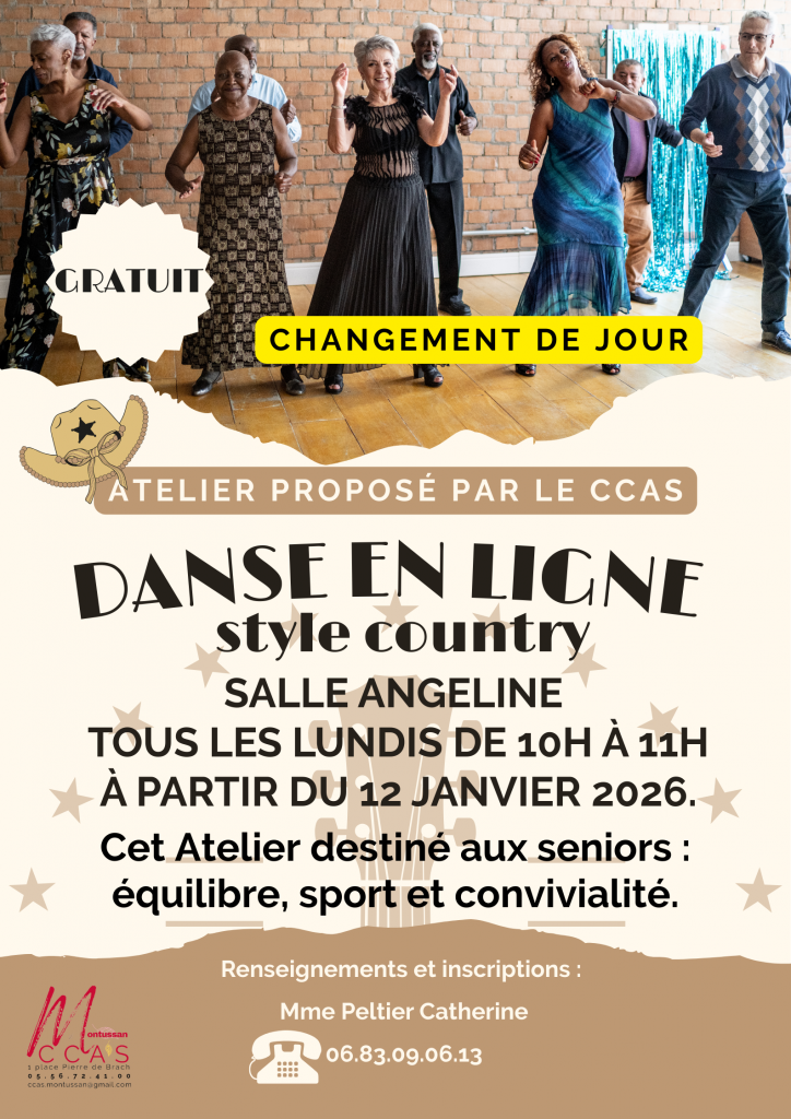 Le CCAS de Montussan vous propose un atelier de danse en ligne (style country), gratuit et ouvert aux seniors.