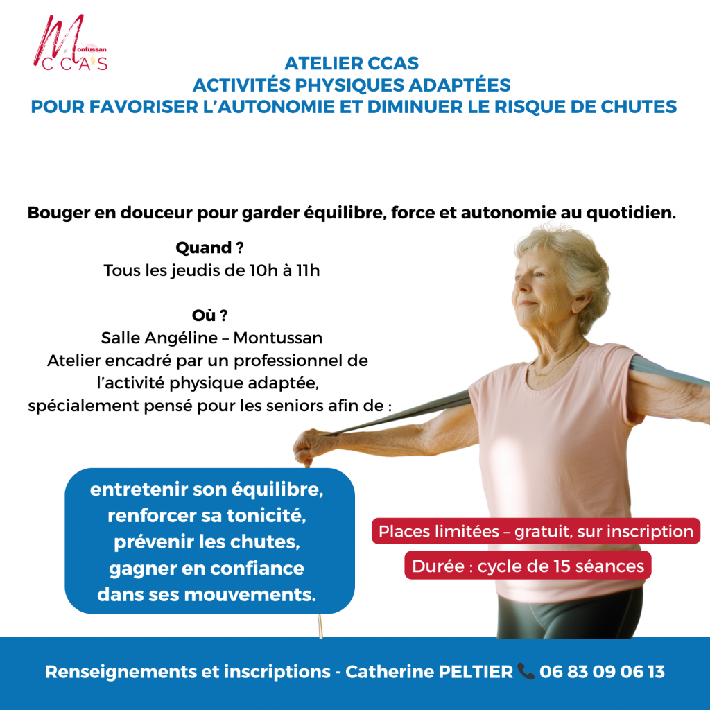 - Atelier “Activités Physiques Adaptées” : pour favoriser l’autonomie et réduire le risque de chutes. Séances en douceur tous les jeudis de 10h à 11h, salle Angéline (cycle de 15 séances, places limitées, sur inscription).