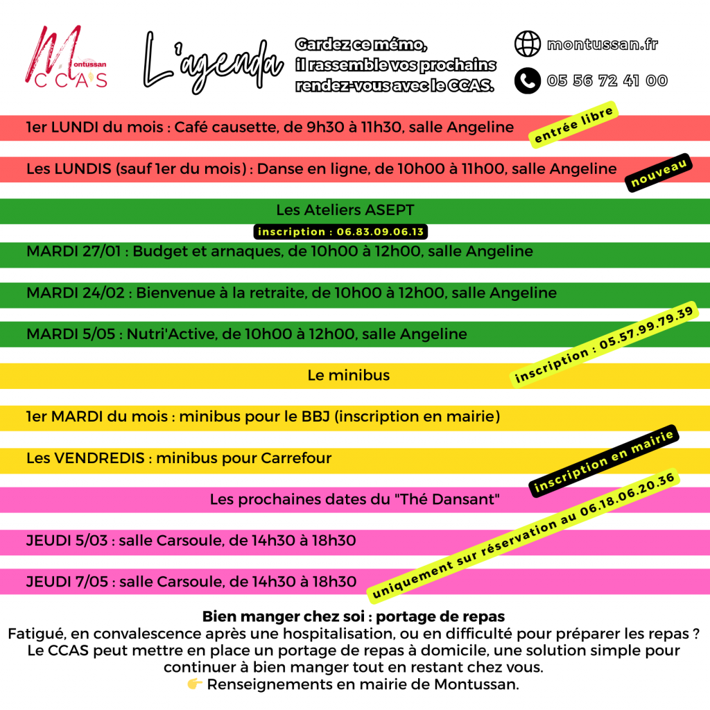 Renseignements / inscriptions : Catherine PELTIER – 06 83 09 06 13 - L’agenda du CCAS : un mémo pratique qui regroupe les principaux rendez-vous (café causette, danse en ligne, ateliers ASEPT, minibus, thés dansants…), avec les dates, horaires et modalités d’inscription.