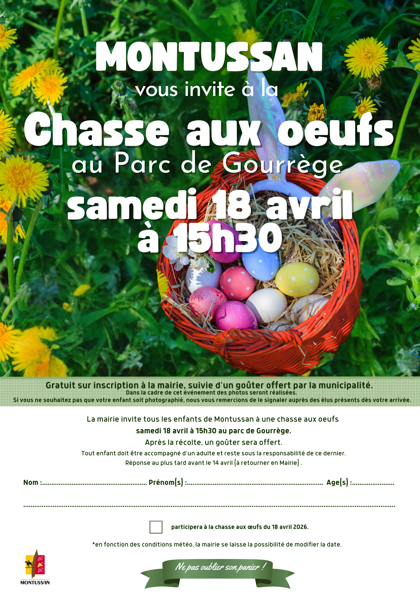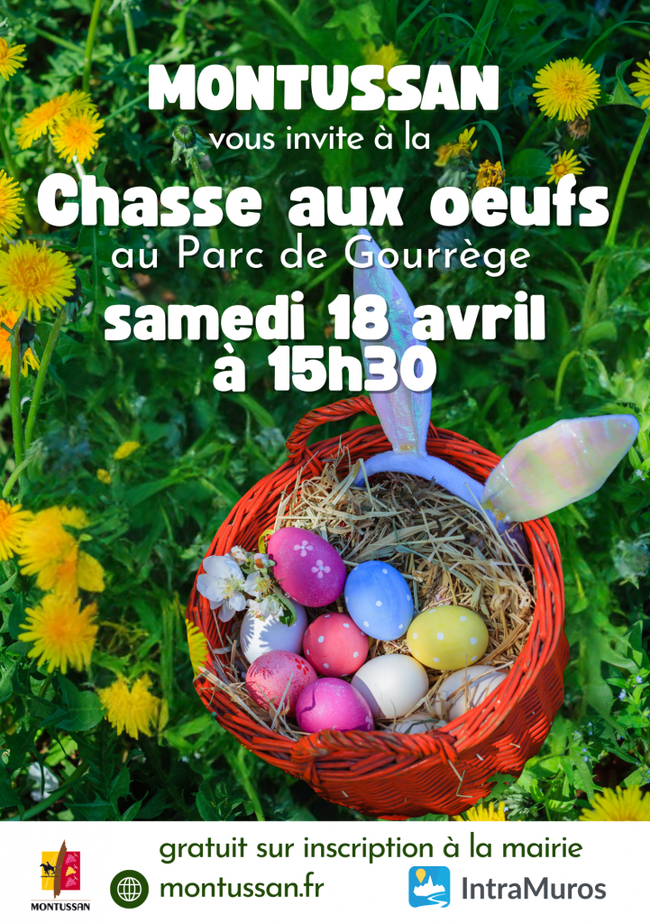 La municipalité de Montussan donne rendez-vous aux enfants pour une chasse aux œufs organisée le samedi 18 avril 2026 à 15h30, au parc de Gourrège.
